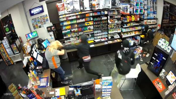 友好诺曼底市场的监控录像显示,一群六名男子抢劫了这家商店,在抢劫过程中,其中一名男子不断殴打收银员。