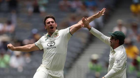 澳大利亚的米切尔·马什在珀斯第一次测试的第三天庆祝巴基斯坦的巴巴·阿扎姆的三柱。