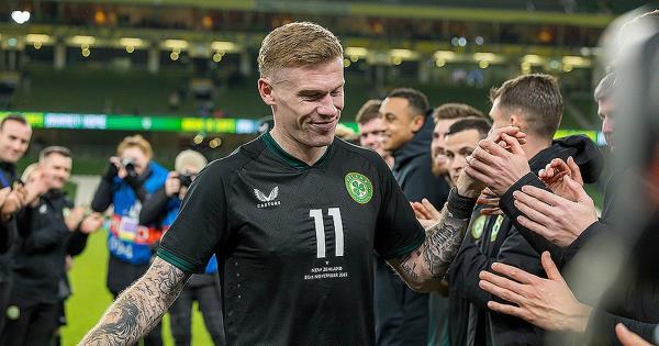 当詹姆斯·麦克林(James McClean)为他代表爱尔兰国家队出场103次的职业生涯落下帷幕时,全场起立为他鼓掌。
