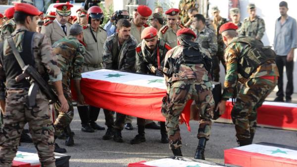 周五上午,从霍姆斯军事医院送出了装有遇难者和覆盖着叙利亚国旗的棺材。军乐队奏响肃穆的乐曲,列队的部队行军礼。在现场,阿巴斯说,流出的鲜血是“宝贵的”。