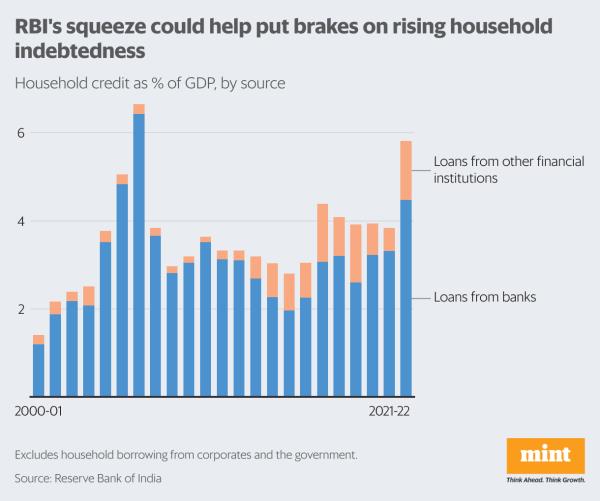 2022-23年,家庭年度借款占GDP的5.8%,是2006-07年以来的最高水平。不足为奇的是,这两个高点都出现在信贷飙升的时期,当时消费者的乐观情绪高涨,放贷机构的谨慎程度降低。2004年至2007年的繁荣之后是企业贷款违约。这一次,人们担心家庭偿还债务的能力。在2018年6月至2023年3月期间,未偿还家庭债务迅速增长,主要是由nbfc的贷款推动的(不包括住房金融和保险)。