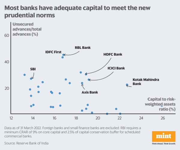 nbfc、金融科技公司和小型金融银行相对更容易受到无担保贷款的影响,但一些大型银行也建立了大量的投资组合。然而,这些银行不太可能受到新的风险权重的影响,因为它们资本充足。有一些例外情况,如RBL银行,其无担保预付款的份额相对较大,资本比率较低。