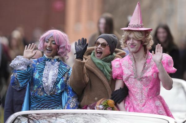 当游行队伍经过剑桥时,身穿棕色外套、戴着帽子和太阳镜的贝宁向人群飞吻,还被变装演员啄了一下双颊。本宁也将在周二晚上参加匆忙布丁剧团的第175场演出“抢劫抢劫宝贝”之前被烤,游行结束时,他和其他几个人一起跳起了罐头舞。