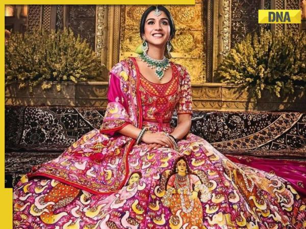 Radhika为婚礼设计的服装是设计师二人组Abu Jani Sandeep Khosla和当代印度艺术家Jayasri Burman合作的杰作。由Rhea Kapoor设计的lehenga不仅是一件衣服,而且是一件艺术品,由Jayasri Burman在特殊的意大利帆布上绘制了12个手绘面板。Jayasri的作品以神话主题而闻名,描绘了象征神圣之爱和人性的天体人物,以及代表阿南特对动物和吉祥的爱的大象。
