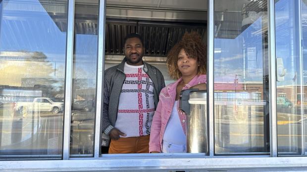 2024年1月24日星期三,在弗吉尼亚州帕克斯利,Theslet Benoir和Clemene Bastien站在他们的Eben-Ezer海地食品卡车里。这对已婚夫妇向联邦法院起诉该镇,指控他们的食品卡车被迫关闭。这对夫妇还说,一名镇议员切断了移动厨房的水管,并尖叫道:“滚回你自己的国家去!(美联社图片/本·芬利)